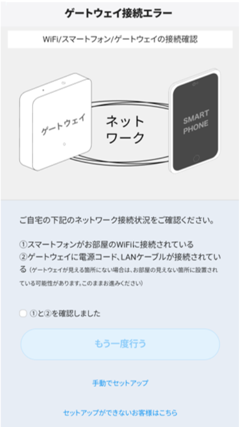 ※スマートフォンがお部屋のWifiに接続していること、IoTゲートウェイ(SmartStation、または、aliehub)が電源コード、LANケーブルに接続されていることをご確認ください。