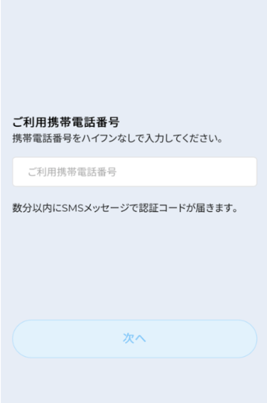 ① アプリ起動後、以下画面で携帯電話番号を入力し、[次へ]をタップしてください。
