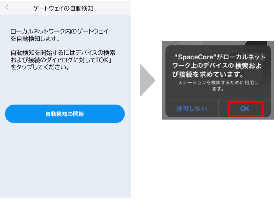 ※「ローカルネットワーク上のデバイスの検索および接続」の許可を求めるダイアログが表示されることがあります。IoTゲートウェイ(SmartStation、または、aliehub)を検知するために利用するので、必ず「OK」をタップしてください。
