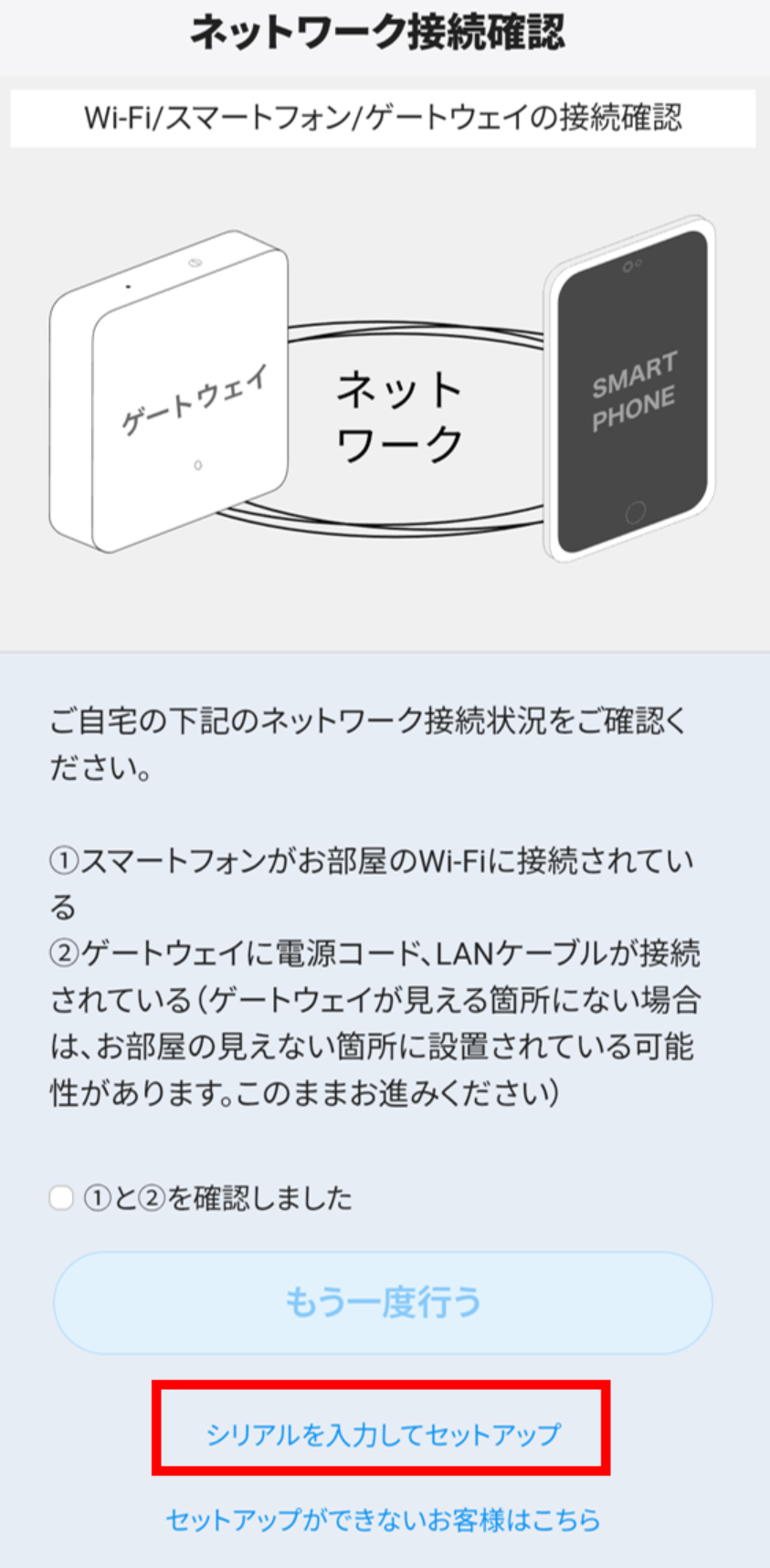 ①「ネットワーク接続確認」画面下部の、「手動でセットアップ」をタップします。