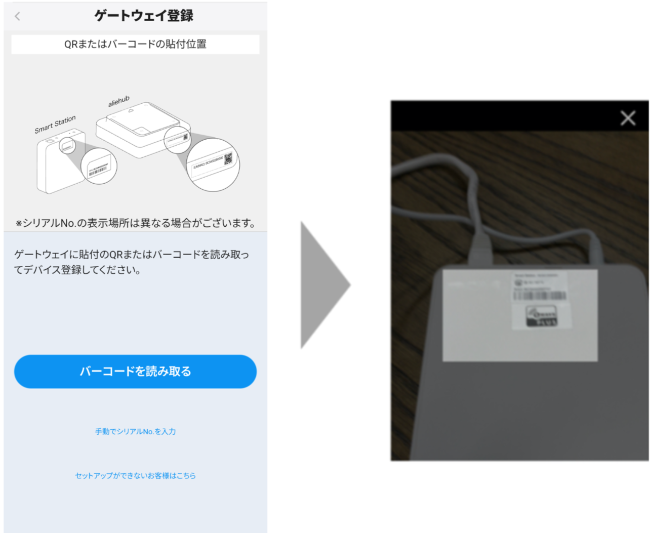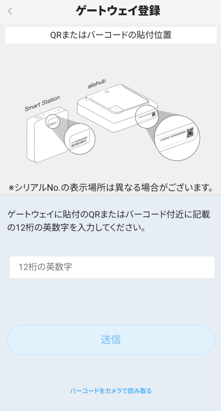 ※バーコードの読み取りができない場合、「バーコードを読み取る」ボタン下の「手動で登録する」をタップし、ゲートウェイのシリアル番号(aliehub:D0AA...、Smart Station:BC34...から始まる12桁の英数字)を入力し、「送信」をタップすることでも登録可能です。