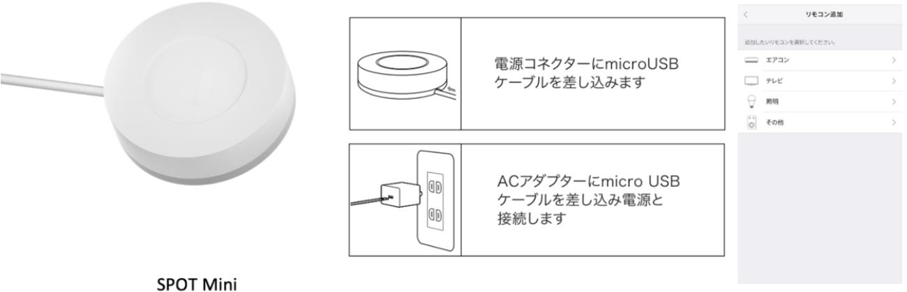 家電リモコン(SPOT Mini)がコンセントに繋がっているのを確認し、アプリの[リモコン追加・編集]より登録します。