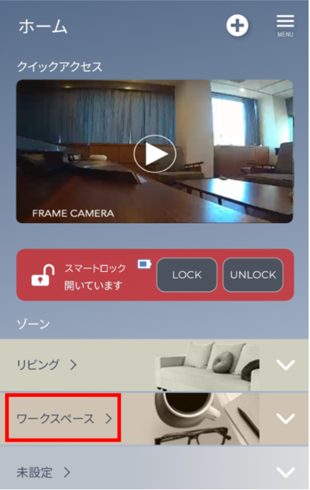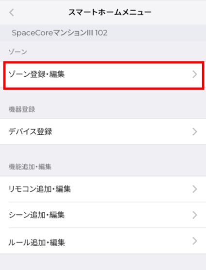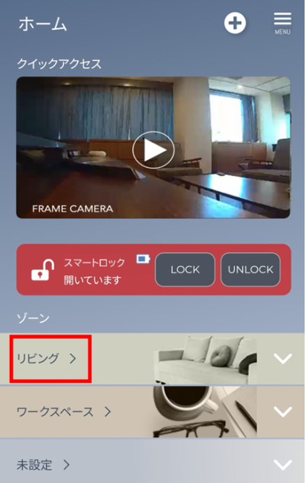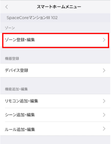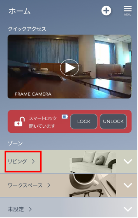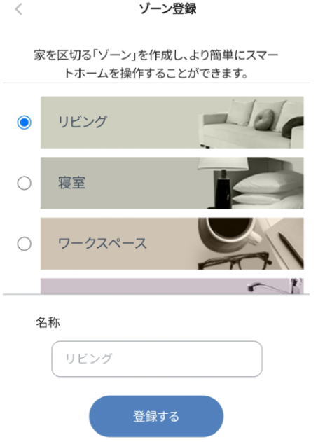 1. スマートホームトップで、デバイスを登録するゾーン名をタップします。