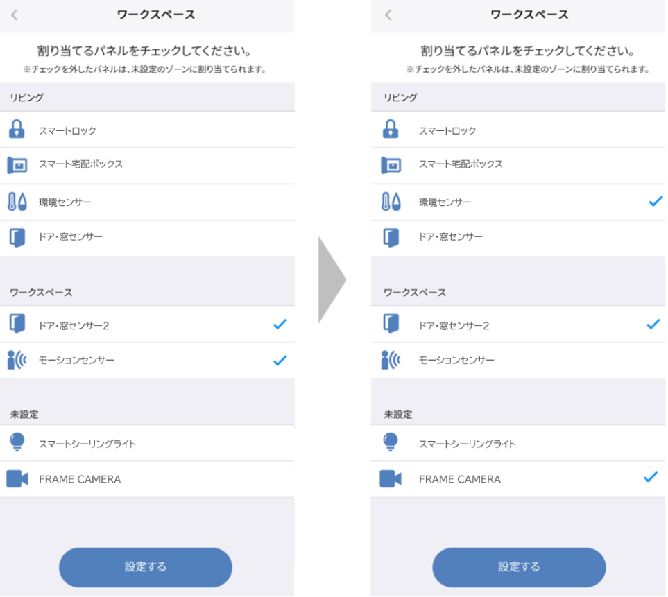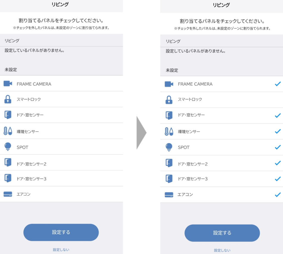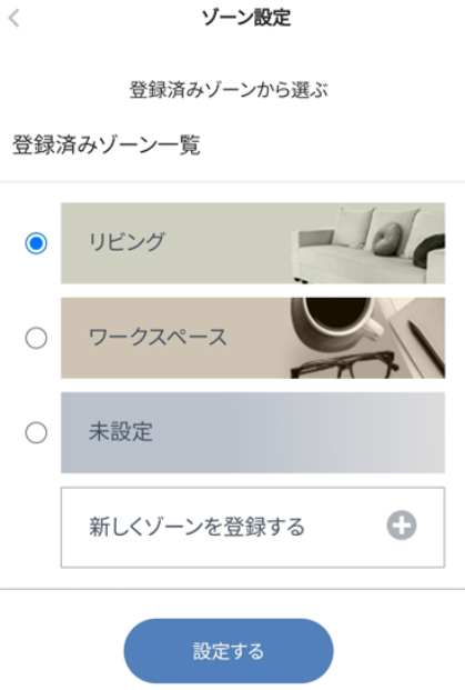 ゾーンに表示したいデバイス/リモコンをタップし、チェックをつけます。ゾーンから外したい場合は、チェックされている状態から再度タップするとチェックが外れます。その後、「設定する」をタップします。