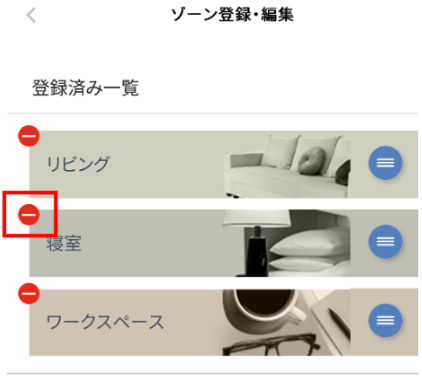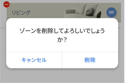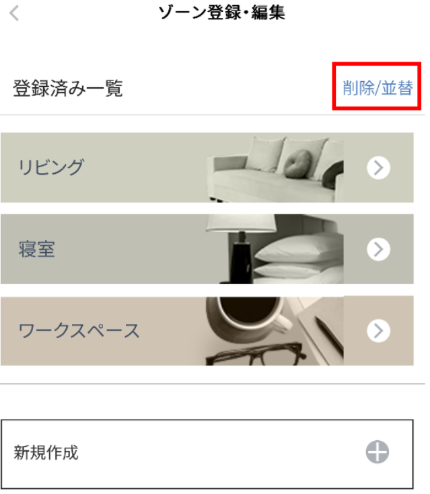 作成したゾーンは並び順を変更したり、削除することができます。ゾーンを削除した場合、削除したゾーンに設定していたデバイスは、ゾーン最下部の「未設定」部分に表示されます。また、全てのゾーンを削除した場合、デバイスは、「マイホーム」部分に表示されます。