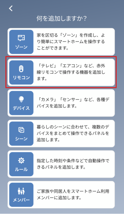 2. 「何を追加しますか?」画面にて[リモコン]をタップします。