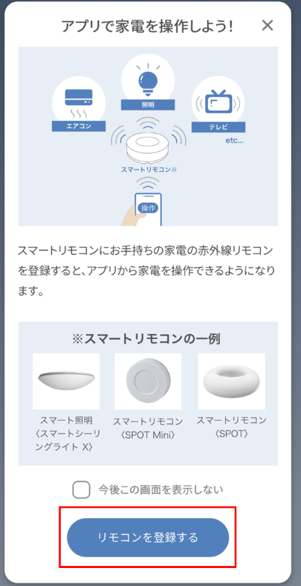 こちらのポップアップ画面からもリモコンを登録することができます。