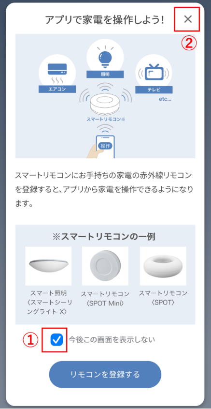スマート家電コントローラーがペアリングされており、いずれにもリモコンが登録されていない場合は、以下のポップアップが表示されます。