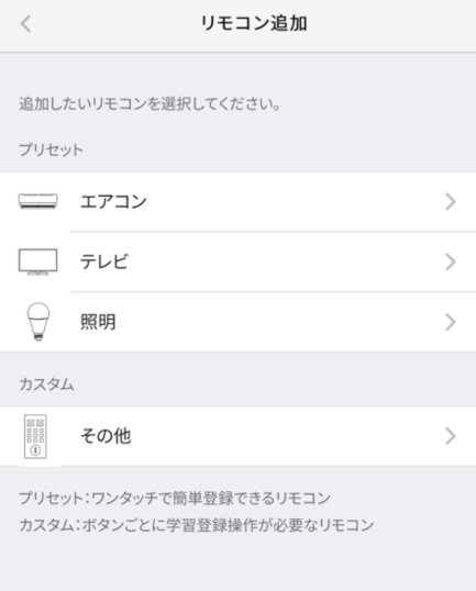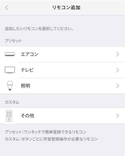 赤外線で操作可能なエアコン・テレビ・照明の一部製品については、リモコン情報の「プリセット」をあらかじめご用意しており、リモコンのボタンを1つずつ登録する必要がありません。