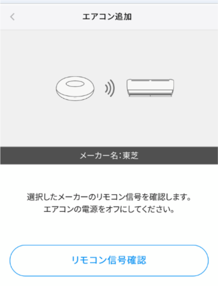 3. エアコンの電源をOFFにしてSPOT/SPOT Mini/スマートシーリングライト/スマートシーリングライト X とエアコン本体の赤外線受信部に遮蔽物がない事を確認し、[リモコン信号確認]ボタンをタップしてください。テストコードがエアコン本体に送信されます。