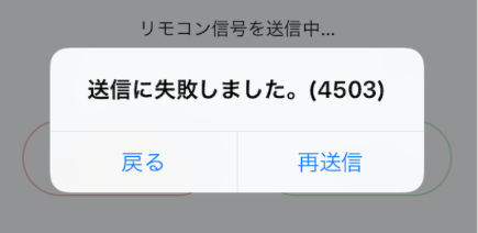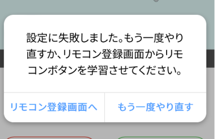 *以下のポップアップが表示された場合、SPOT/SPOT Mini/スマートシーリングライト/スマートシーリングライト X からエアコンまでリモコン信号が届いていない(エアコンまで距離がある、間に遮蔽物がある等により)ので、SPOT/SPOT Mini/スマートシーリングライト/スマートシーリングライト X の位置を変えてみてください。
