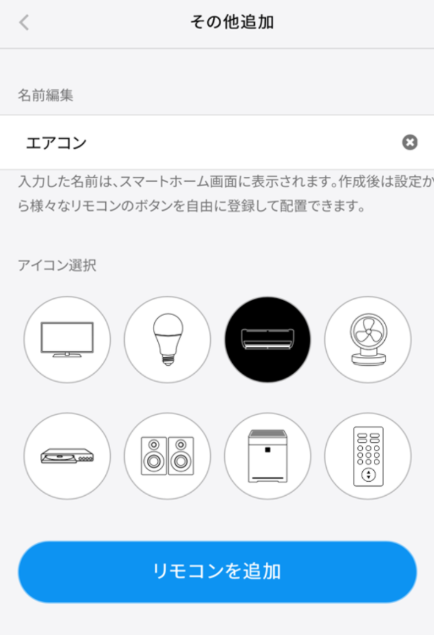 2. リモコン操作の対象機器名を入力し、表示させたいアイコンを選択して、[リモコンを追加]ボタンをタップしてください。