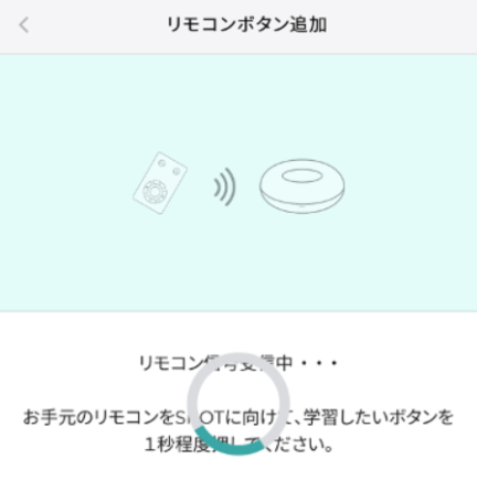 5. 以下の画面が表示されたら、家電製品のリモコン送信部をSPOT/ SPOT Mini/スマートシーリングライト/スマートシーリングライト X の赤外線受光部に向け、学習させたいボタンを1回押してください。この際、SPOT/ SPOT Miniの赤外線受光部とリモコンの送信部の距離が10cm以内になるようにしてください(スマートシーリングライト/スマートシーリングライト X の場合は、リモコンの送信部をなるべくシーリングライトに近づけてください) 。