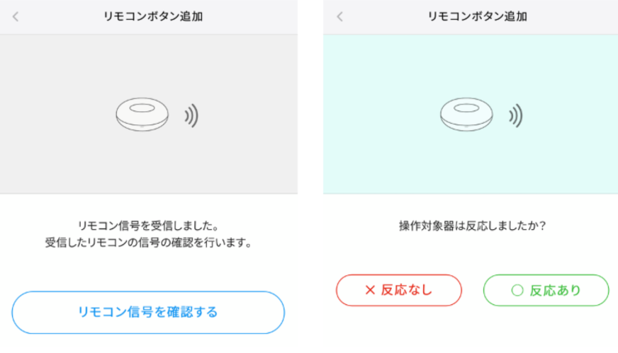 家電製品が反応しない場合は[反応なし]をタップしてください。家電製品が反応した場合は[反応あり]をタップしてください。反応があるまで、複数回テストを行います。