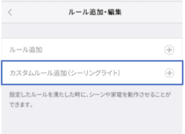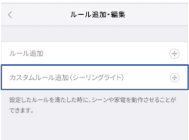 ※スマートシーリングライトが導入されている場合は、下記のように表示されます。スマートシーリングライトに紐づく家電を操作する場合は、[カスタムルール追加(シーリングライト)] の「+」をタップしてください。