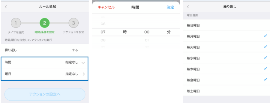 ここでは、例として、平日の朝7:00に、アクションを実行するように設定する方法を説明します。