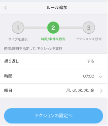 次に、[アクションの設定へ]ボタンをタップし、アクションを設定します。