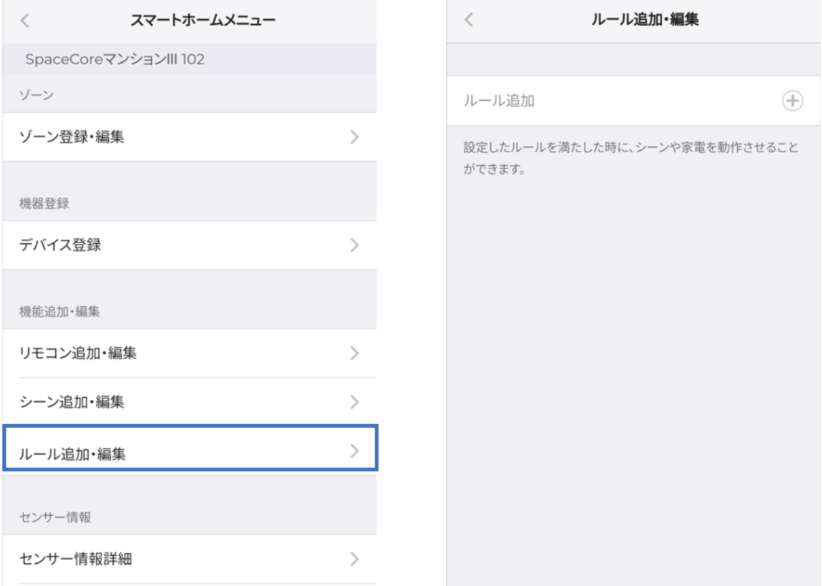 ※スマートシーリングライトが導入されている一部物件の場合は、下記のように表示されます。スマートシーリングライトに紐づく家電を操作する場合は、[カスタムルール追加(シーリングライト)] の「+」をタップしてください。