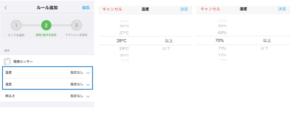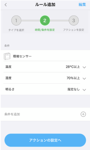 ここでは、例として、温度が28℃、湿度が70%以上になったら、アクションを実行するように設定する方法を説明します。