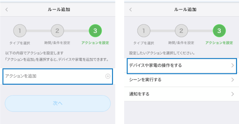 1. [アクションを追加]をタップし、[デバイスや家電の操作をする]をタップします。
