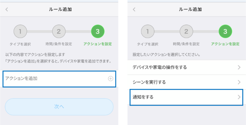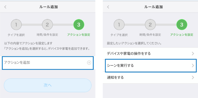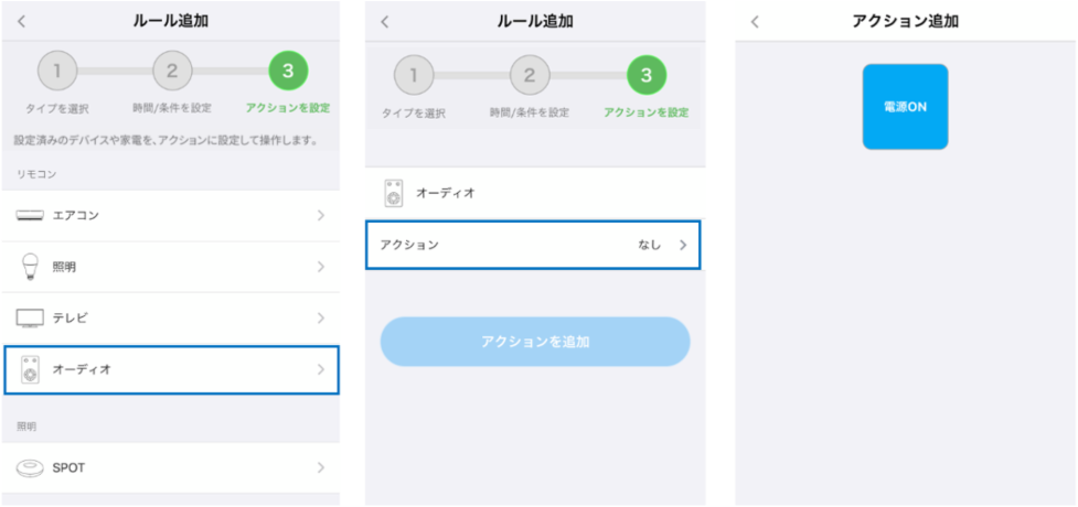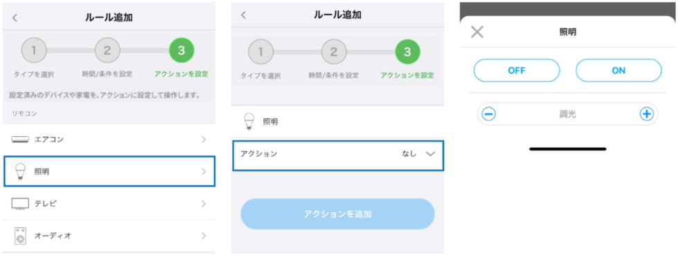 ※アクションで操作したい対象の機器の登録、リモコン追加や、シーンは、予め設定しておく必要があります。