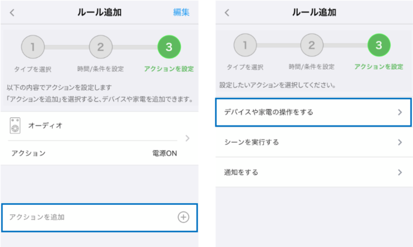 3. 続いて、照明をONにするアクションを追加します。[アクションを追加]をタップし、[デバイスや家電の操作をする]をタップします。