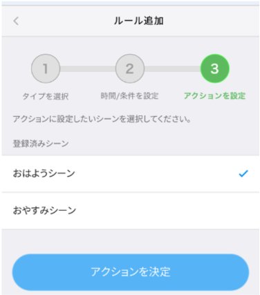 2. アクションに設定するシーンを選択し、[アクションを決定]をタップすると、アクションにシーンが追加されます。