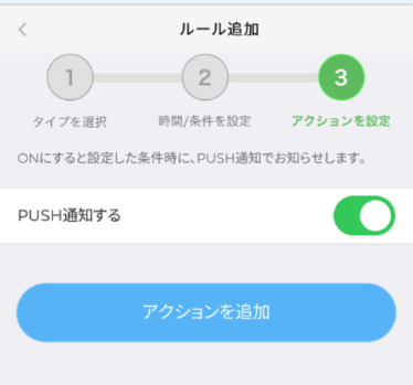 2. PUSH通知するをONにして、[アクション追加]をタップすると、アクションに通知が追加されます。