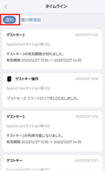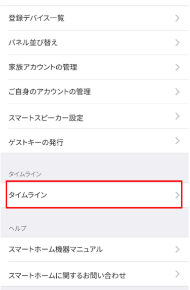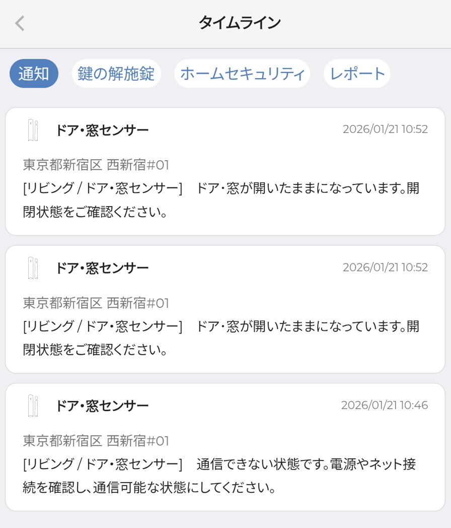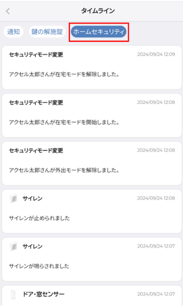 タイムラインから、センサー通知編集方法 で設定した過去のIoT通知情報や、鍵の解施錠、ホームセキュリティの履歴を確認することができます。