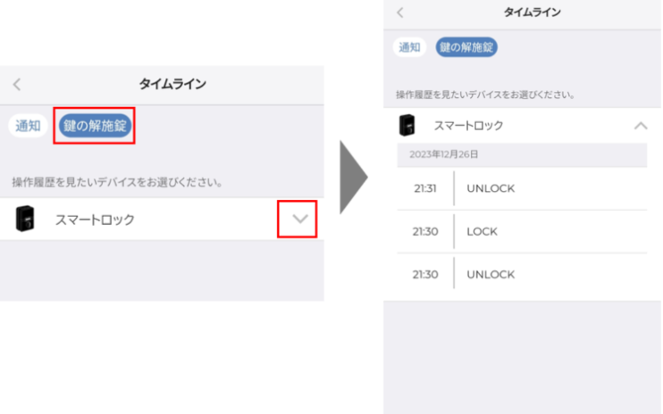 ※過去7日間までの履歴を確認することができます。LOCKの右端に表示されている∨をタップすると、鍵の解施錠履歴を確認することができます。
