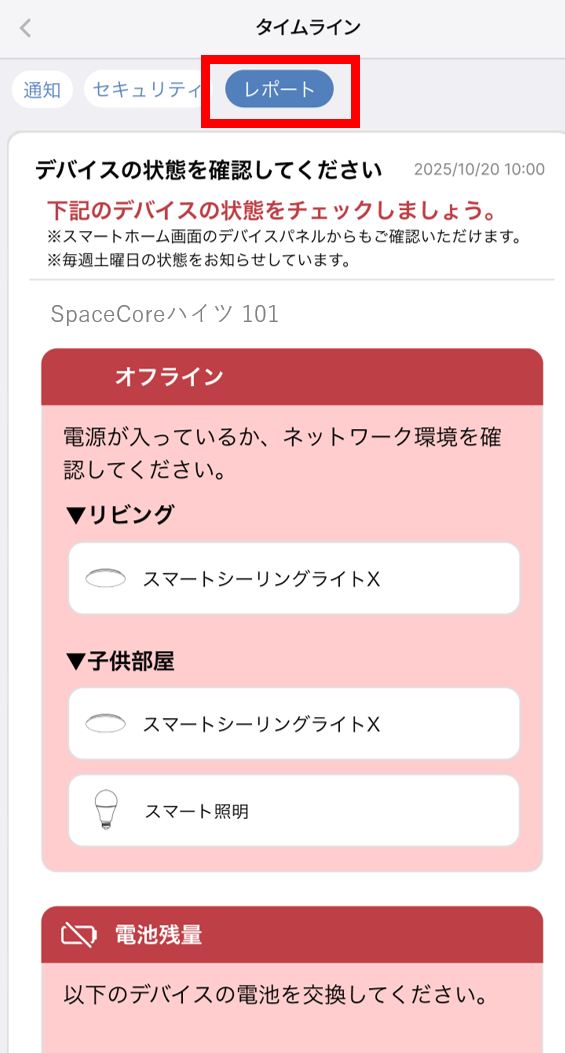 また、オフラインのデバイスや電池残量の少ないデバイスがある場合は、毎週土曜日にレポートが配信されます。※機能により遡って確認できる期間が異なります。