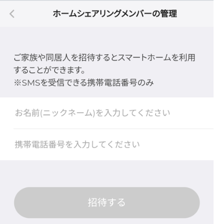 3. スマートホームをご利用になるご家族のお名前(ニックネーム)と、携帯電話番号を入力した後、[招待する]をタップしてください。