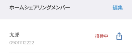※手順5で共有しなかった場合でも、招待中のホームシェアリングメンバーのをタップすることで、招待メッセージを共有することができます。