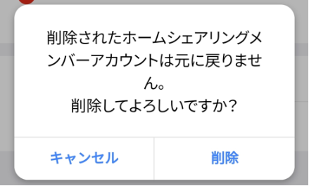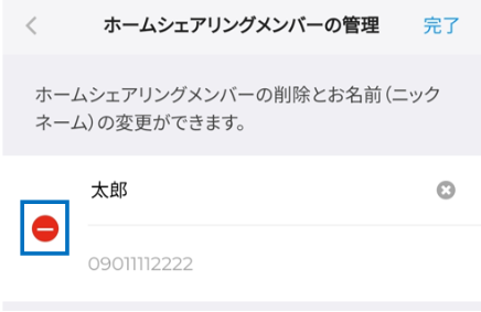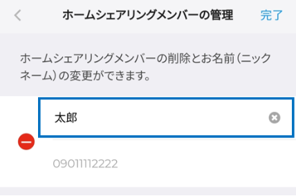 電話番号を上書き編集することはできませんので、変更前の電話番号のホームシェアリングメンバーの[−]タップ、ポップアップ表示後[削除]タップにて削除を行い、もう一度、あたらしい電話番号でホームシェアリングメンバー追加を行ってください。