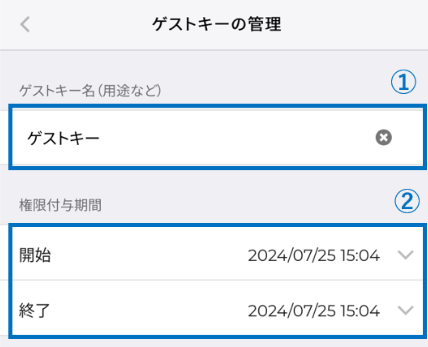4.  ①ゲストキー名は任意で編集いただき、②権限付与期間を入力します。