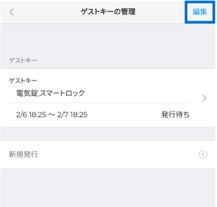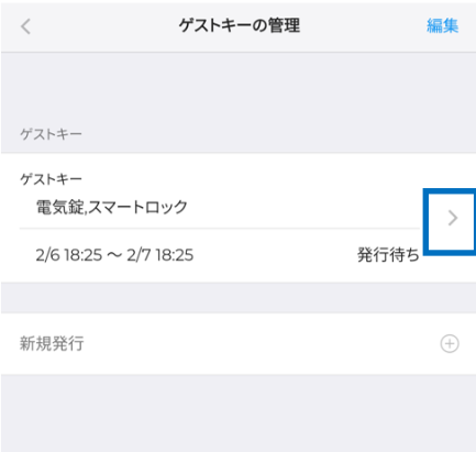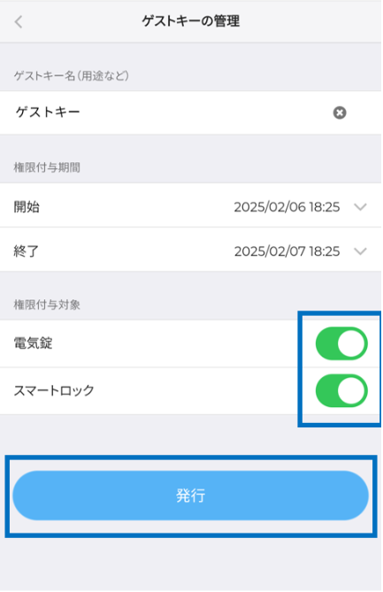 5. 権限付与対象がオンになっていることを確認し、「発行」をタップすると、ゲストキーが作成されます。