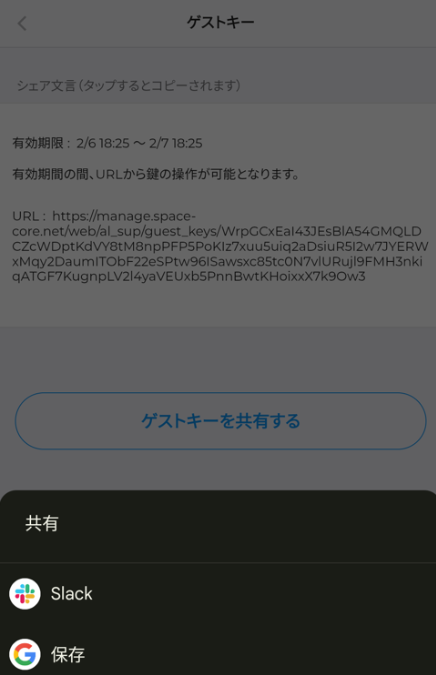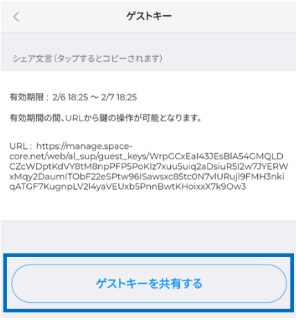 6. 内容を確認後、「>」をタップします。「ゲストキーを共有する」をタップすると、その上の「シェア文言」項目に記載の内容がコピーされます。