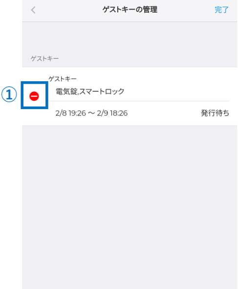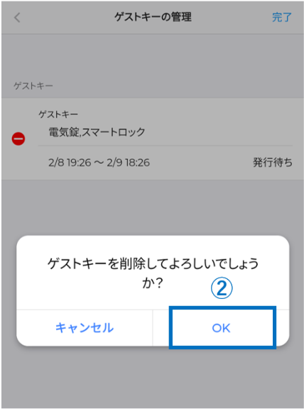 4. ①削除するゲストキーをタップした後、②「OK」をタップし、ゲストキーを削除します。