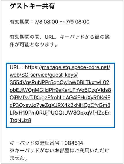 ゲストキーを発行すると、URLと、暗証番号キーが発行されますので、その情報を、ゲストキーをご利用になる方に共有ください。ゲストキーを共有された方は、URLをタップするか、暗証番号キーを入力することにより、鍵の施錠/解錠ができるようになります。