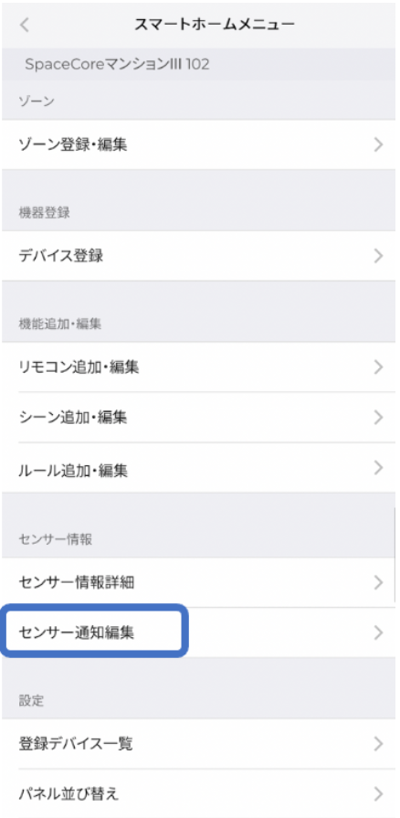 2. スマートホームのメニューから、「センサー通知編集」をタップします。