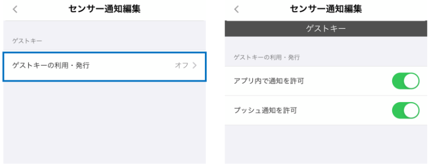 3. ゲストキーの利用・発行をタップし、 適宜、「アプリ内で通知を許可」「プッシュ通知を許可」をオンにします。