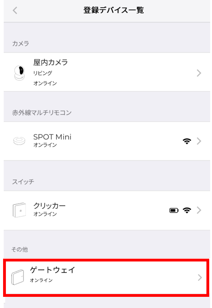 ※利用できる新しいファームウェアがない場合は、このお知らせは表示されません。2.ファームウェアアップデートしたいデバイスを選択します。(ここでは、ゲートウェイ<aliehub>を例に説明します)