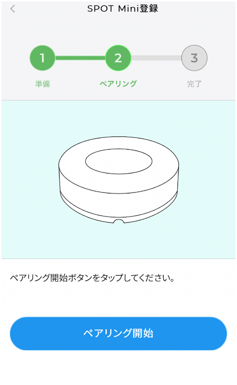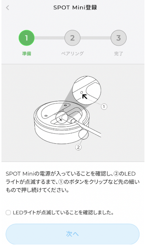 3.「SPOT Mini」をタップします。4.アプリ画面の指示通り、SPOT Miniを電源コードに接続し、SPOT Mini側面のLEDが緑色に点滅するまで①のボタンを押し続けてください。②のLEDライトが緑色に点滅したら、「ライトが緑色に点滅していることを確認しました。」をタップし、「次へ」をタップしてください。