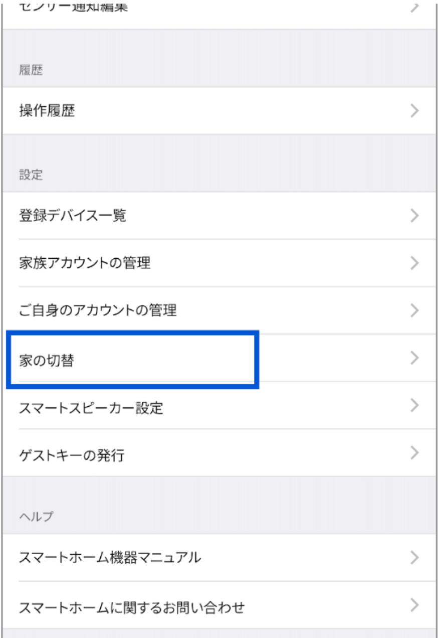 スマートホーム設置物件を複数所有されている場合に、「家の切替」にて、対象物件を切り替えることができます。