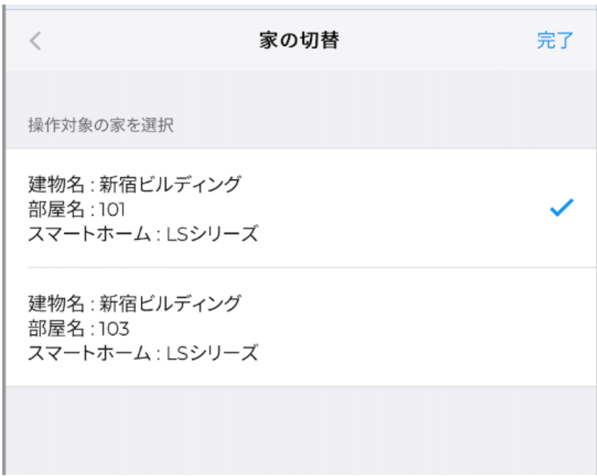 3. 「家の切替」画面が開き、切替可能な家の選択肢が表示されますので、表示させたい物件をタップしてチェックを入れ、右上の「完了」をタップします。