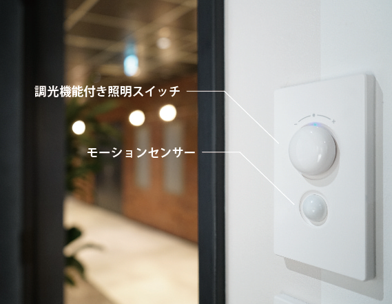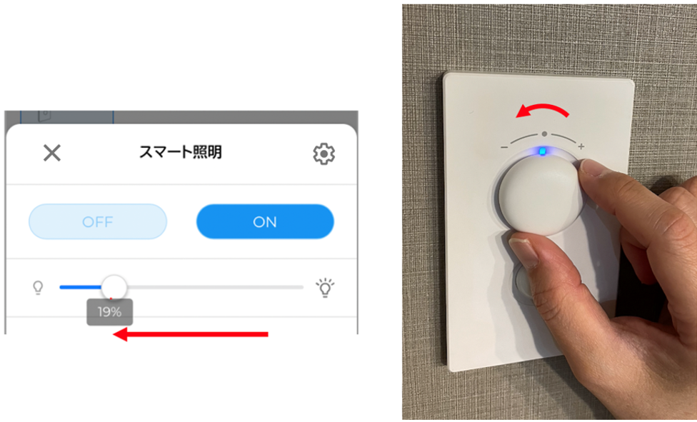 ④スマートホームトップに戻り、「スイッチ」のパネル、または、Dimmer & Motion Sensor 本体のツマミで、調光操作し、照度を暗くした場合にチラツキがないか等をご確認ください。