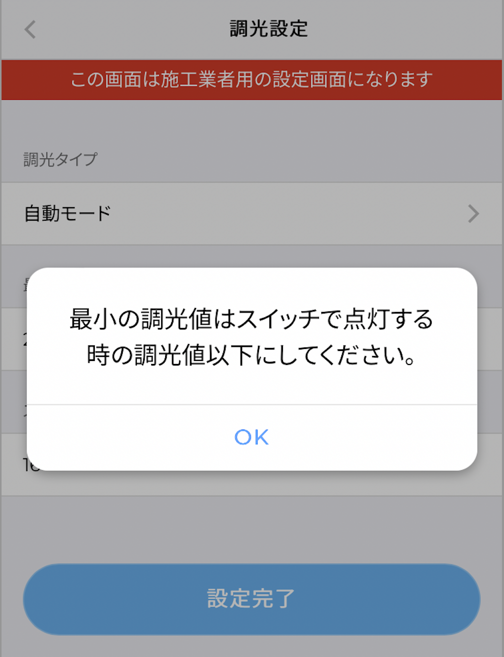「最小の調光値」の値が、「スイッチで点灯する時の調光値」の値を上回っているため、設定完了できません。「スイッチで点灯する時の調光値」の項目の値を、「最小の調光値」で設定した値よりも大きな値に選択しなおしてください。