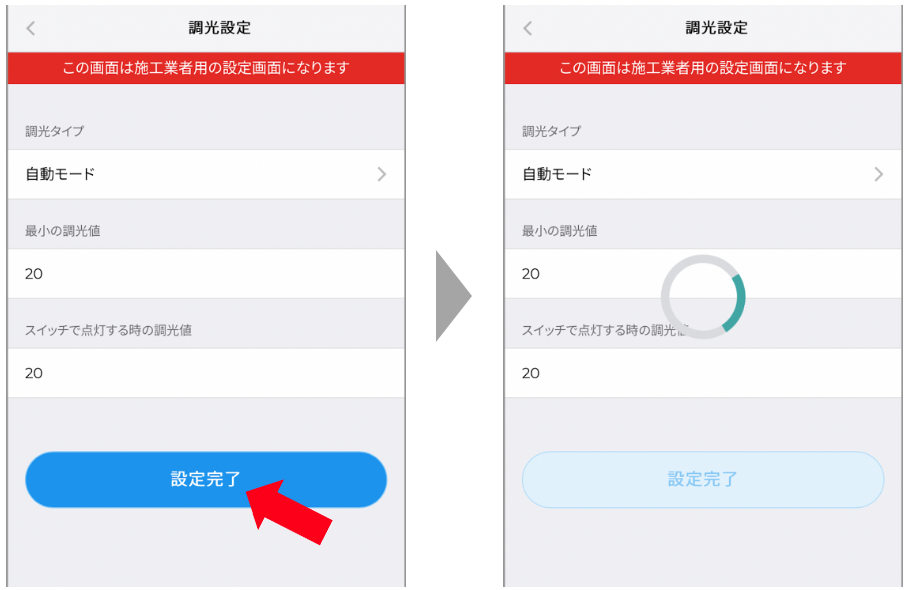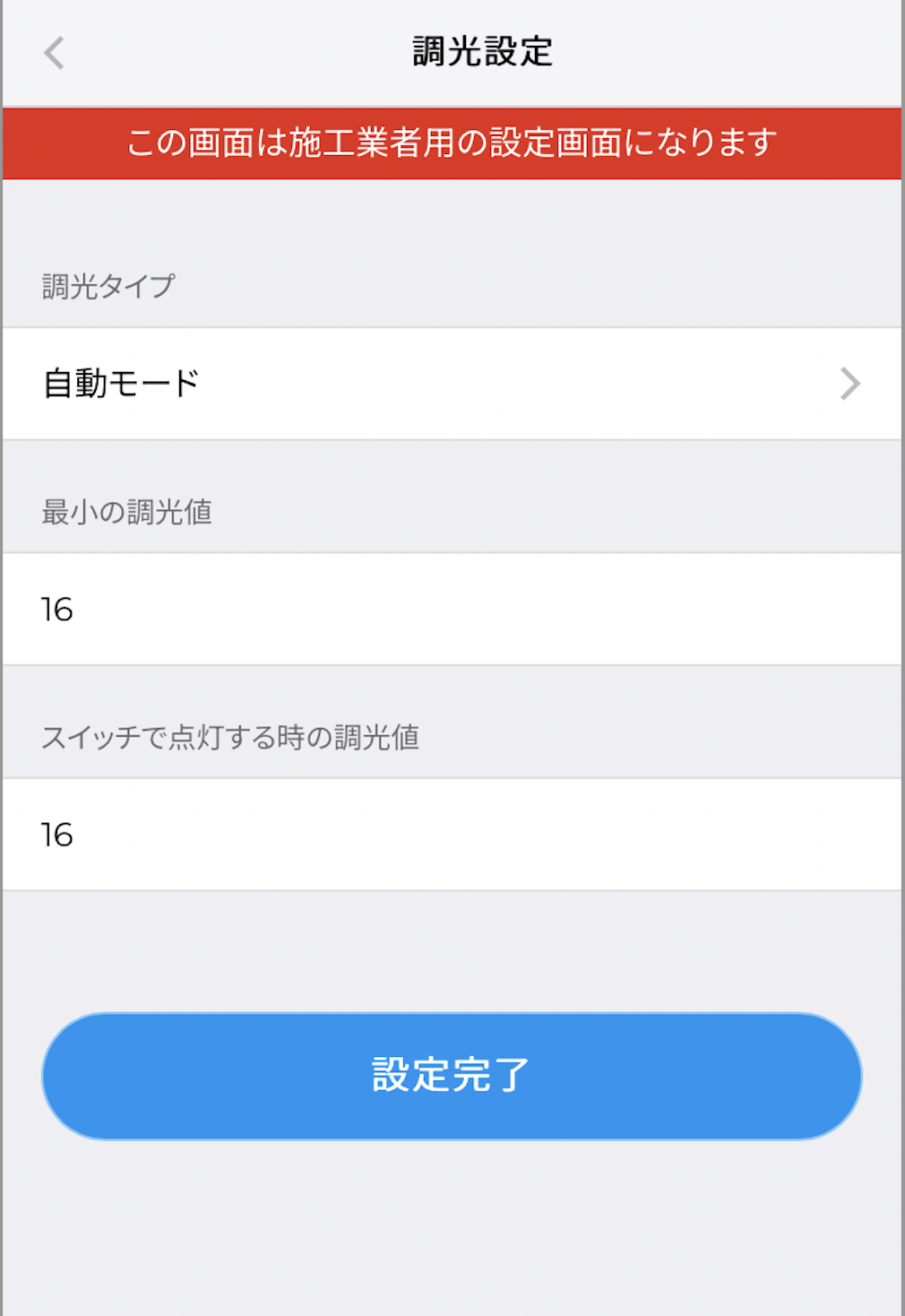選択した後、画面左上の「←」をタップして、調光設定画面に戻りますので「設定を完了」ボタンをタップし設定を完了します。