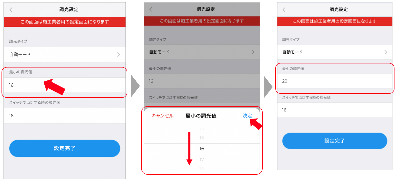 ①まず「最小の調光値」の項目をタップし、値をプルダウンから選択後、[決定]をタップします。