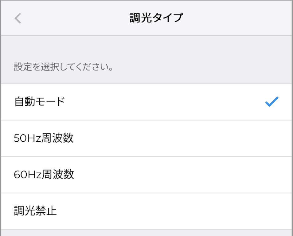 調光設定画面内の「調光タイプ項目」をタップ、ご使用の環境に合わせて選択します。(デフォルト値は「自動モード」になっています)